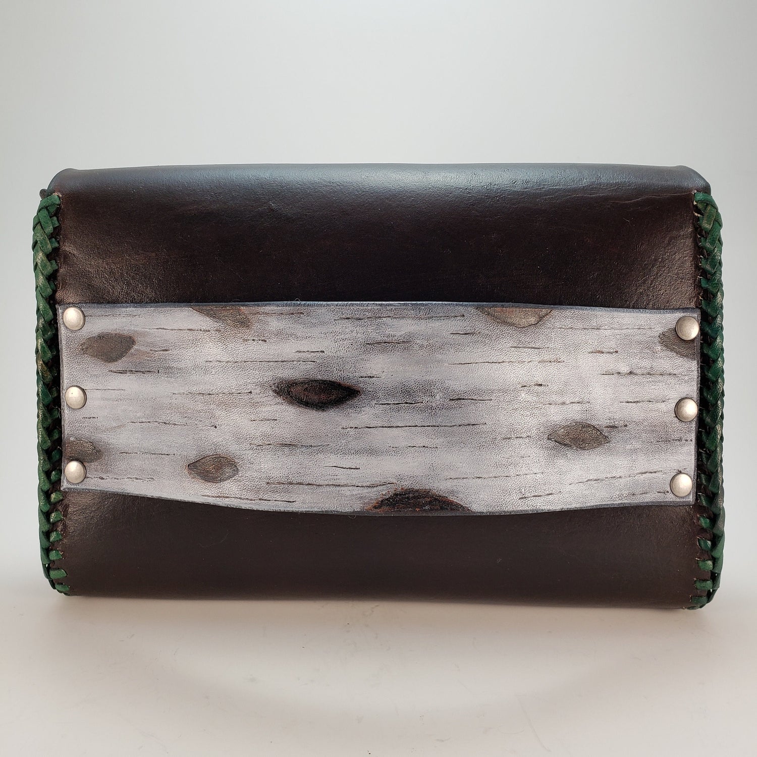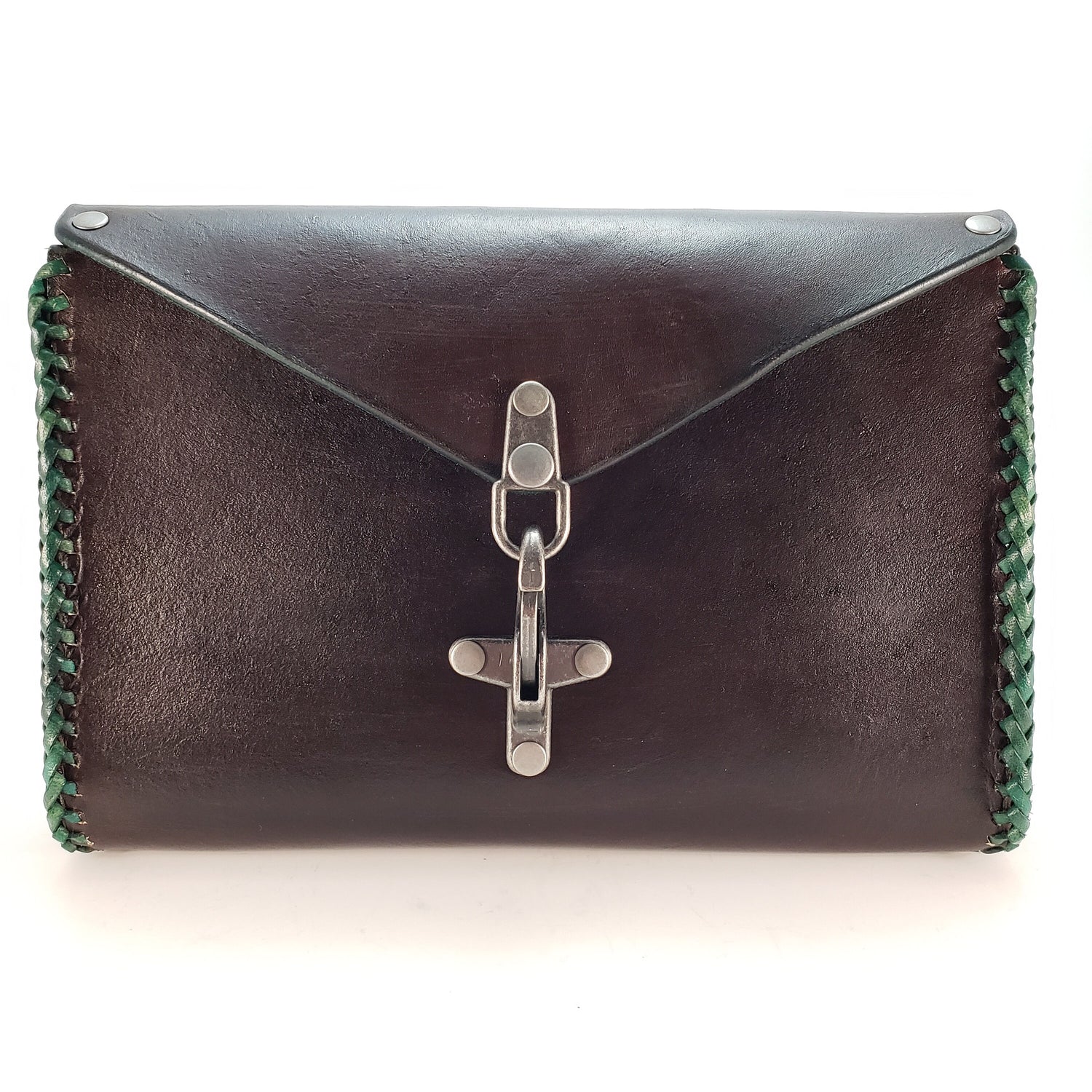 This clutch is made from 4 to 5 oz. veg-tanned leather. It was hand-cut, dyed and hand laced by me. The design on the handle and sides were hand tooled/carved into the leather. This bag is perfect for a night out on the town, any special occasion, or just because. It fits all your essentials (phone, small wallet, makeup, etc..). The handle fits over your hand which makes carrying it comfortable and fashionable.